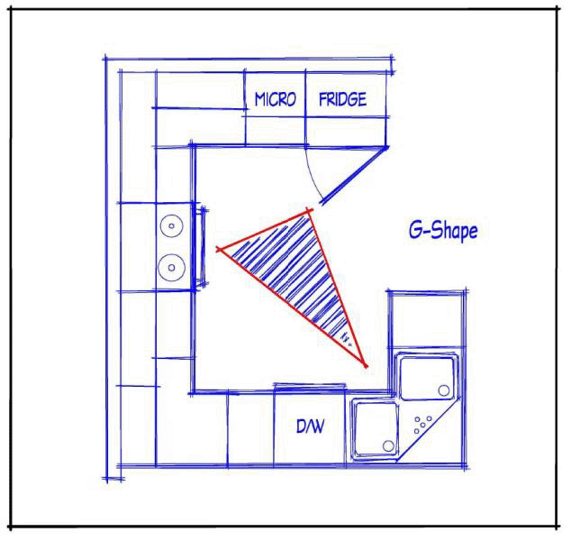 The downside to the G shape kitchen plan is that it does limit access to the main kitchen area so care must be taken so the kitchen doesn't feel cramped. Make certain there is plenty of room between the leg of the G and cabinetry on the opposite wall. Try to keep an entry access distance of no less than 48 inches here.